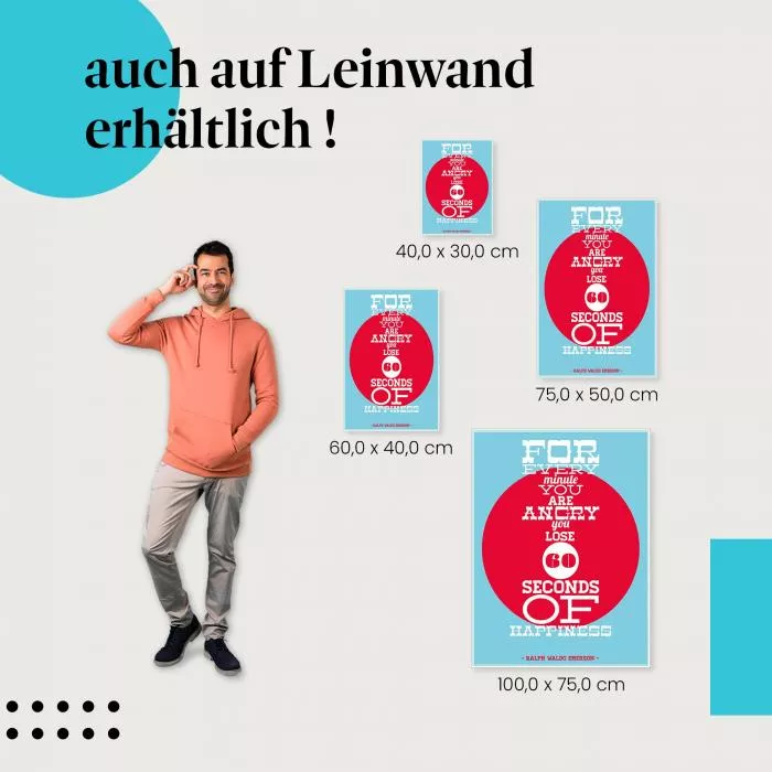 Lebensweisheit von Emerson: Beeindruckendes Poster mit Zitat von Ralph Waldo Emerson: "For every minute you are angry you lose sixty seconds of happiness."