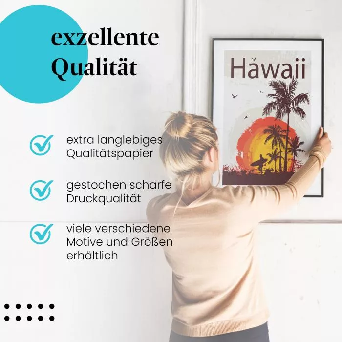 Ein Poster mit Palmen, Surfern und einem glühenden Sonnenuntergang fängt die entspannte Atmosphäre Hawaiis ein. Ein Traumziel für Surfer und Sonnenanbeter. Dieses Bild verkörpert die Schönheit und die Freiheit der hawaiianischen Inseln.