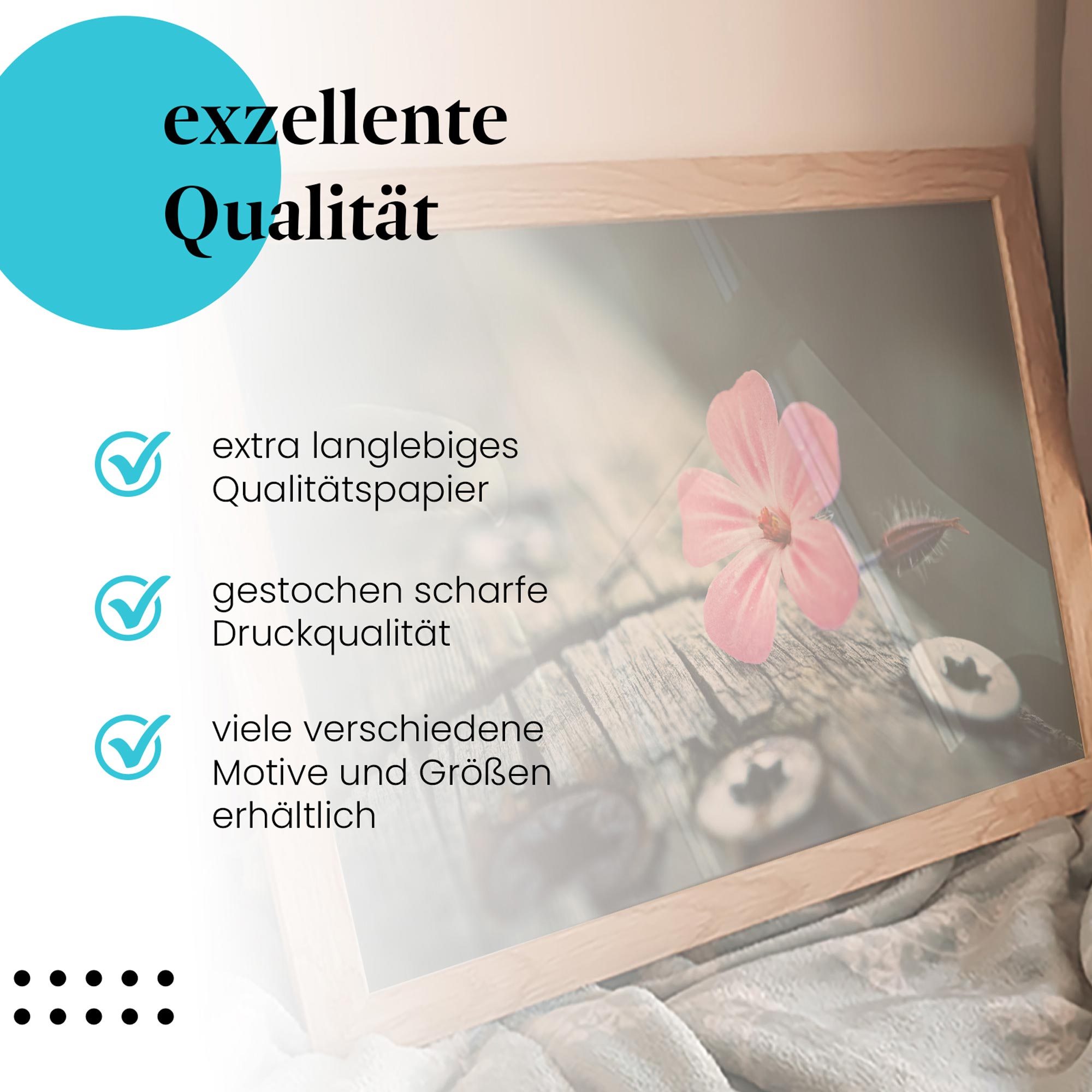 - Hochwertige Leinwand auf Echtholzrahmen (bei Leinwandbildern):