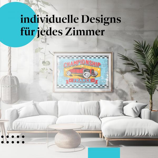 Ein rotes Rennauto im Vintage-Stil rast über die Rennstrecke - das Design "Championship France" erinnert an die glorreichen Zeiten des französischen Motorsports.