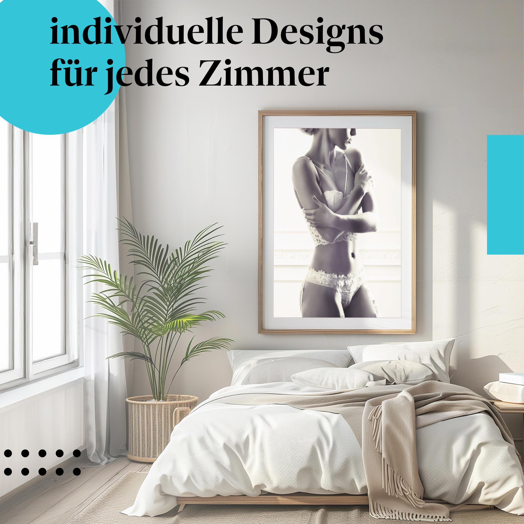 Eine Frau in eleganter Unterwäsche steht in einem hellen Raum. Das Licht betont ihre Silhouette und die Details der Spitze.