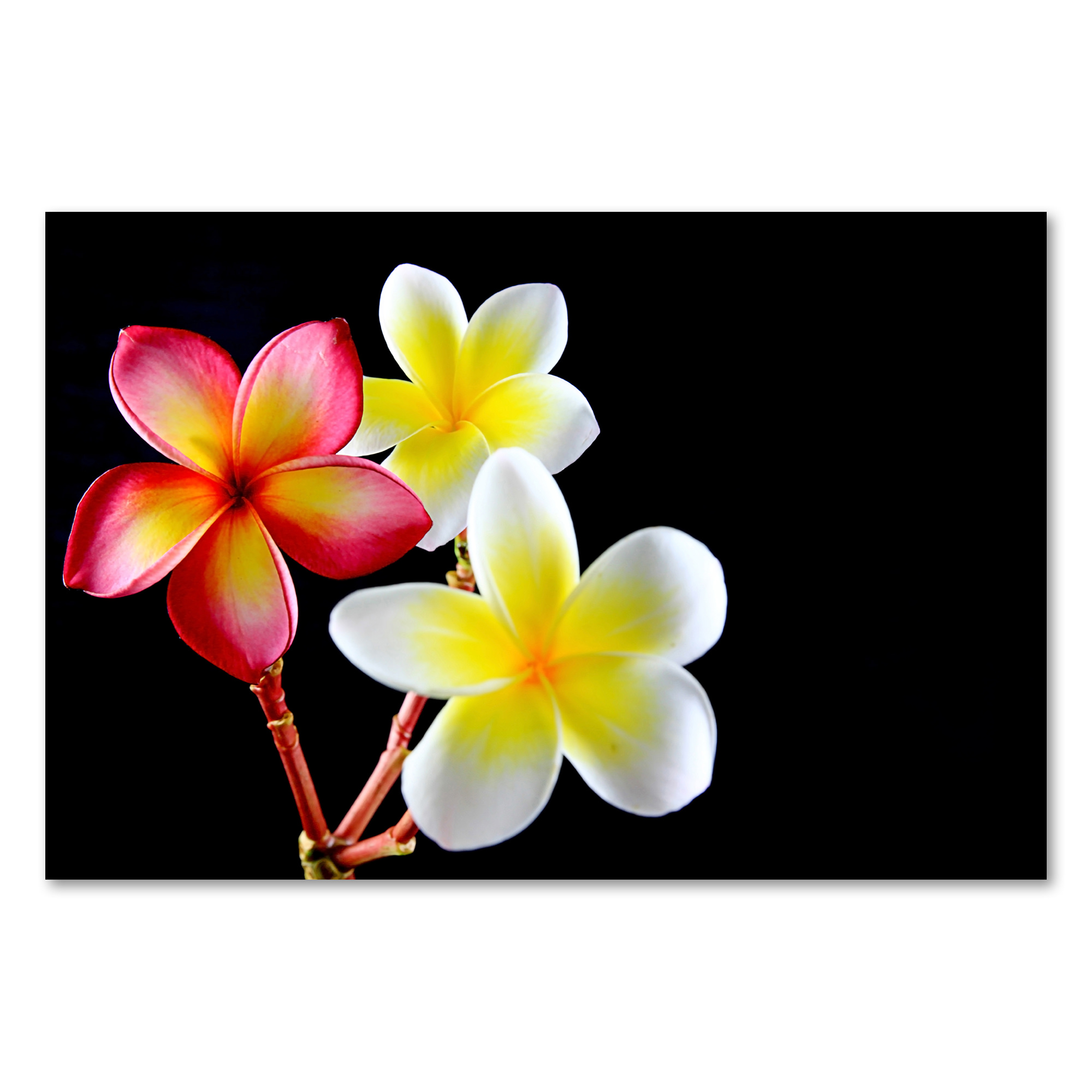 Bestellen Sie jetzt "Exotische Blüten: Frangipani auf Schwarz" und holen Sie sich ein Stück Exotik direkt nach Hause!