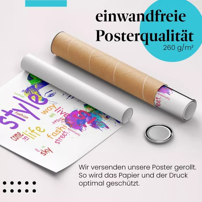 - Poster: Gedruckt auf 260 g/qm starkem Satin-Fotopapier für eine edle Optik und langanhaltende Freude. Wir legen großen Wert auf Nachhaltigkeit und verwenden ausschließlich Papier aus verantwortungsvollen Quellen.