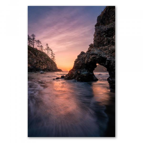 Ein Felsbogen am Strand wird von der untergehenden Sonne in warme Farben getaucht. Die Wellen des Meeres rauschen an den Strand und erzeugen eine traumhafte Stimmung.