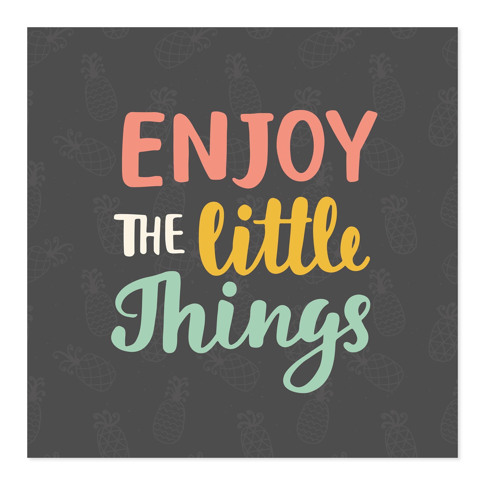 Fröhliche Typografie "Genieße die kleinen Dinge" auf grauem Hintergrund mit Ananas-Muster. Perfekt für positive Vibes und Achtsamkeit.