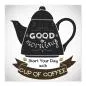 Schwarze Kaffeekanne mit der Aufschrift "Guten Morgen" und dem Spruch "Beginne deinen Tag mit einer Tasse Kaffee". Ideal für Kaffeeliebhaber und den Start in den Tag.