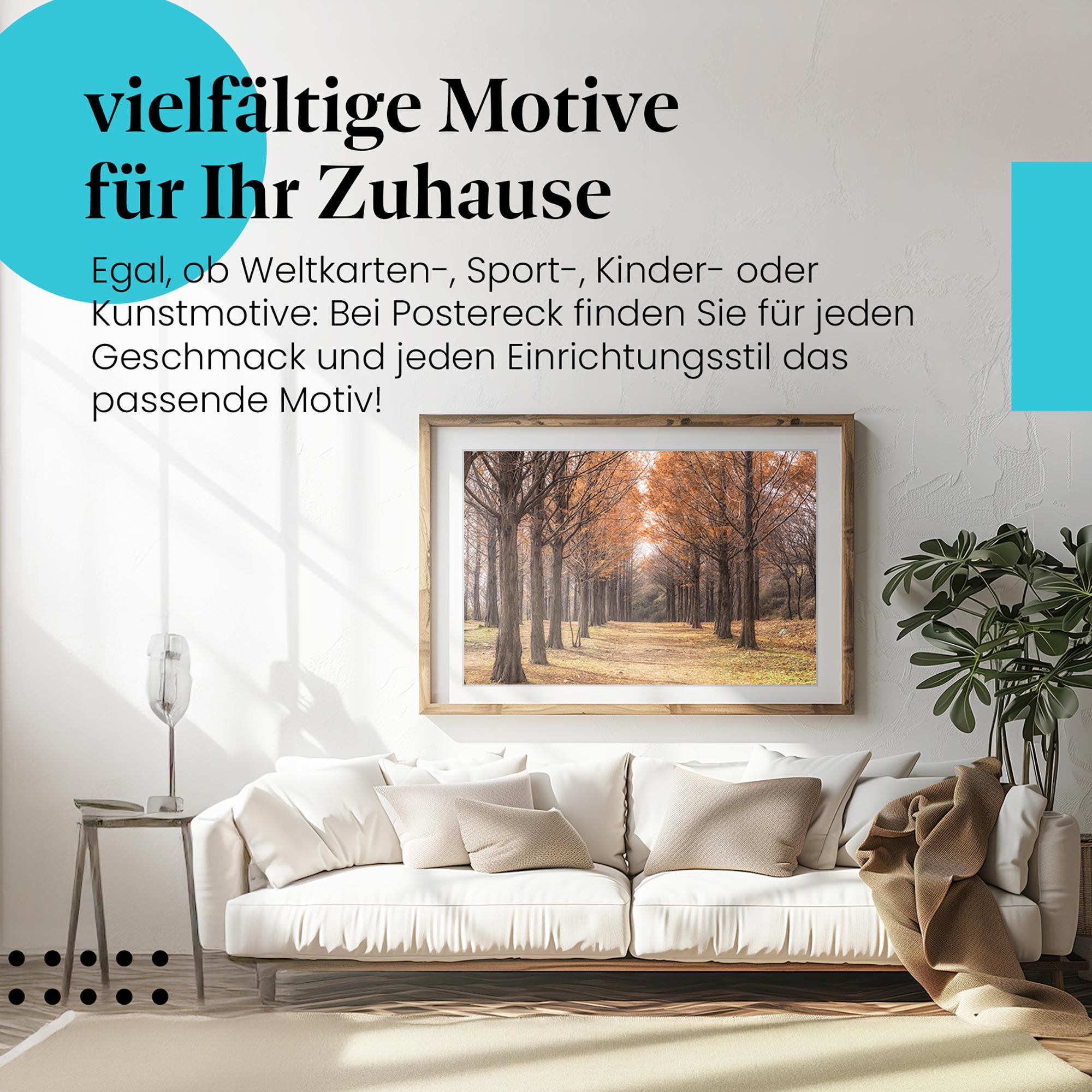 Dieses herbstliche Motiv zeigt eine Allee mit hohen Bäumen in warmen Herbstfarben, die zu einem Spaziergang einlädt.