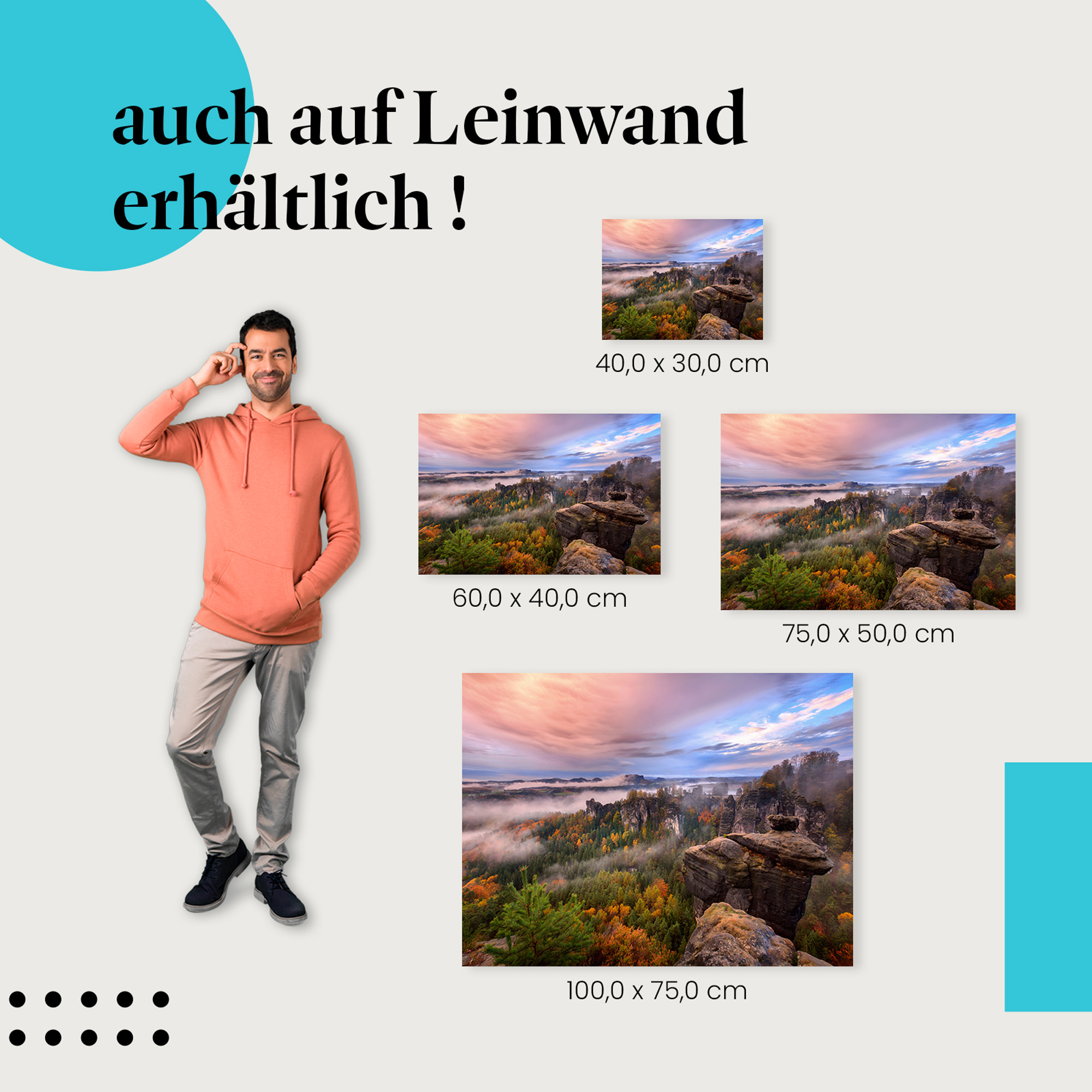 Von einem Felsen aus bietet sich ein atemberaubender Blick auf eine herbstliche Landschaft. Nebel liegt über den Wäldern und Felsen und taucht die Szenerie in eine mystische Stimmung.