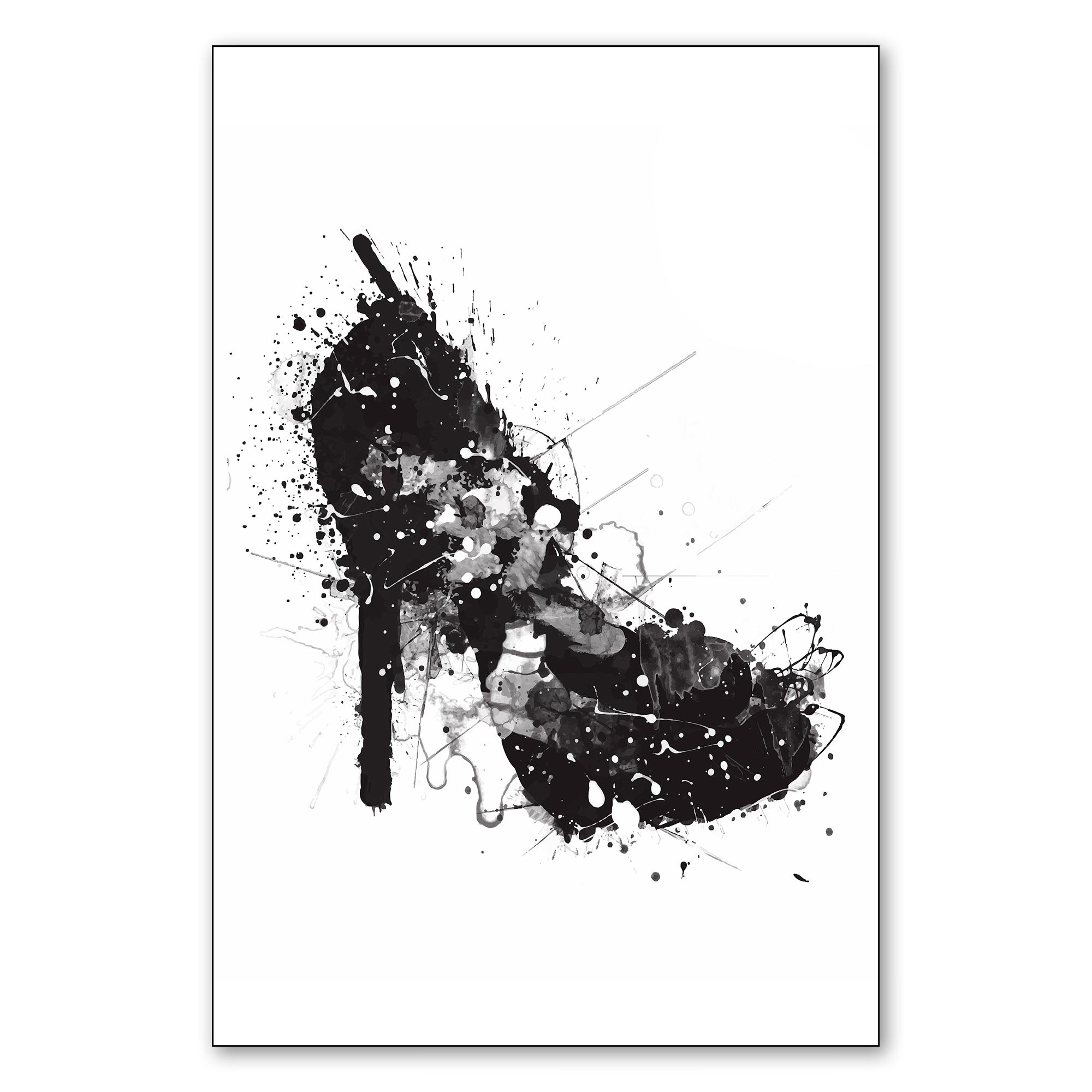 Kunst und Eleganz: Ein abstrakter Druck eines schwarzen High Heels mit Farbspritzern. Ein echter Blickfang - perfekt für alle, die Mode und Kunst lieben.