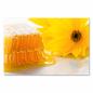 Eine goldgelbe Honigwabe mit frischem Honig und einer leuchtend gelben Blume daneben. Der Honig fließt langsam über die Wabe und verspricht puren Genuss.