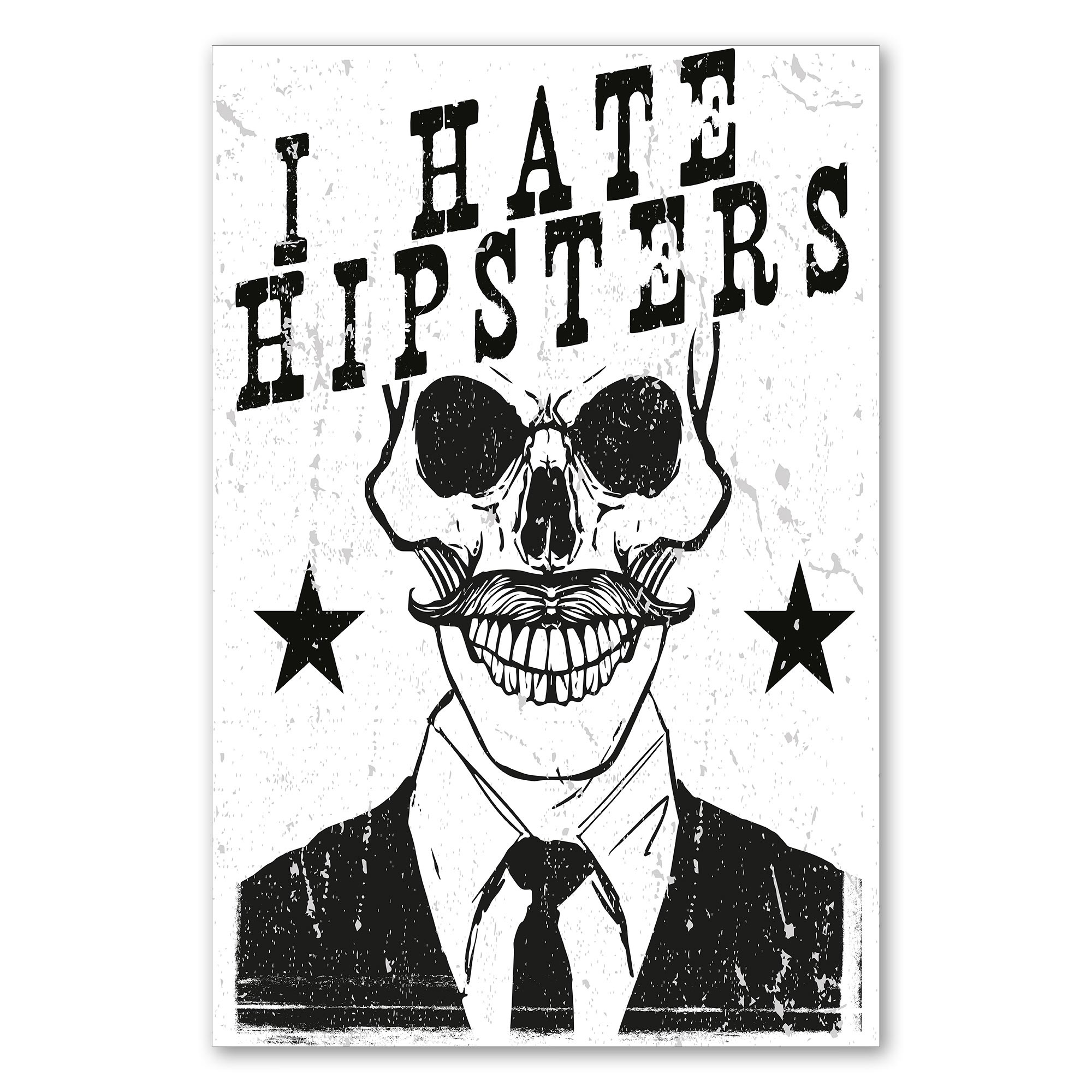 Schwarz-weiß Grafik eines Skeletts mit Hipster-Bart und Anzug. Der Text "I Hate Hipsters" rundet das rebellische Design ab.