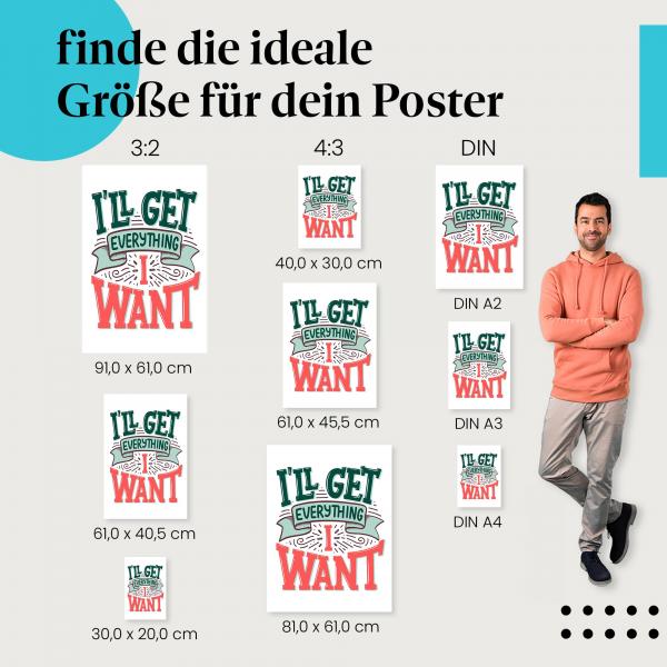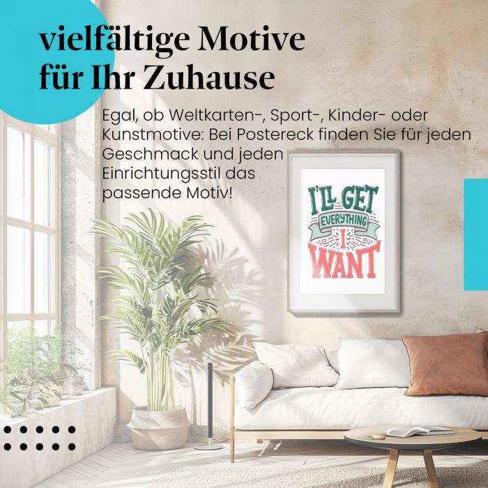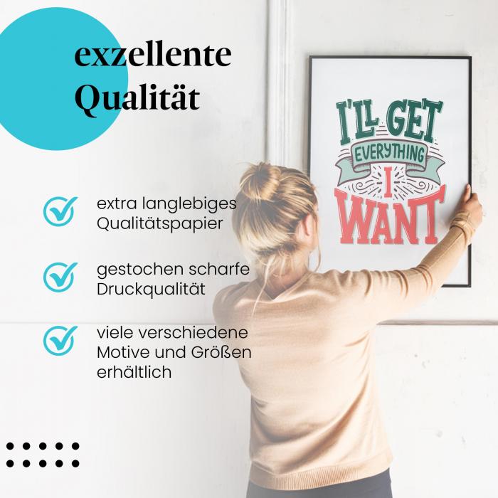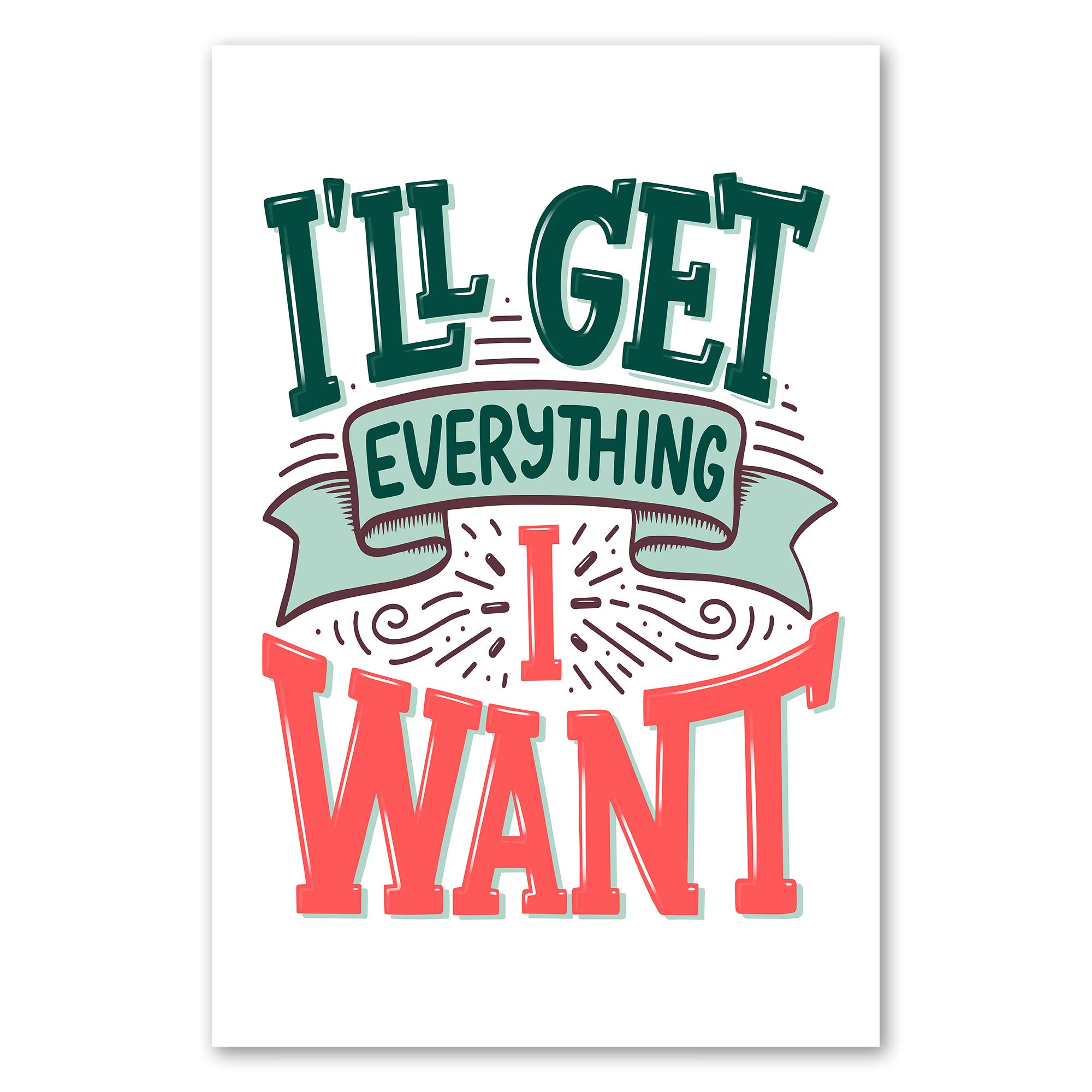 Typografie-Poster mit dem Spruch "I'll get everything I want" in kräftigen Farben und verspielter Schrift. Motivierend und selbstbewusst.