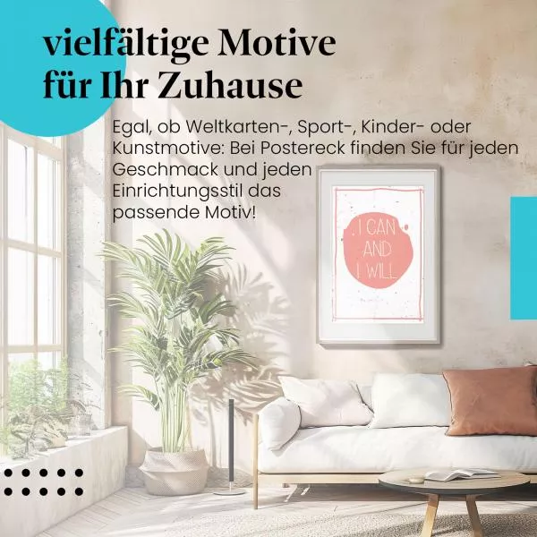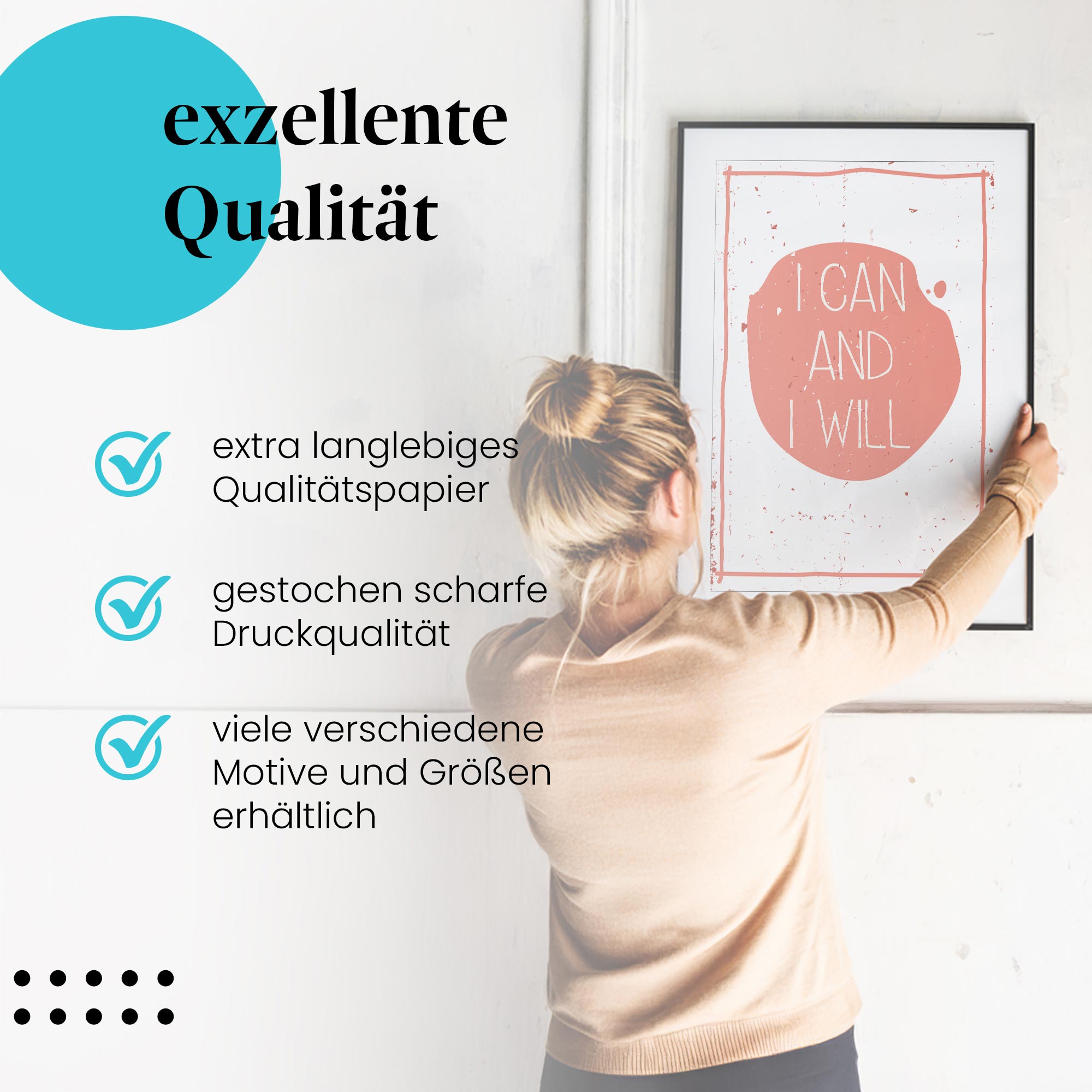 Dieses kraftvolle Motiv mit der Aussage "I can and I will" im modernen Design ist ideal für alle, die an sich glauben und ihre Ziele erreichen wollen. Ein echter Motivations-Boost für dein Zuhause oder Büro!
