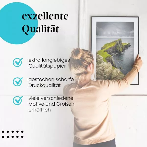 - Poster: Gedruckt auf 260 g/qm starkem Satin-Fotopapier für eine edle Optik und langanhaltende Freude. Wir legen großen Wert auf Nachhaltigkeit und verwenden ausschließlich Papier aus verantwortungsvollen Quellen.
