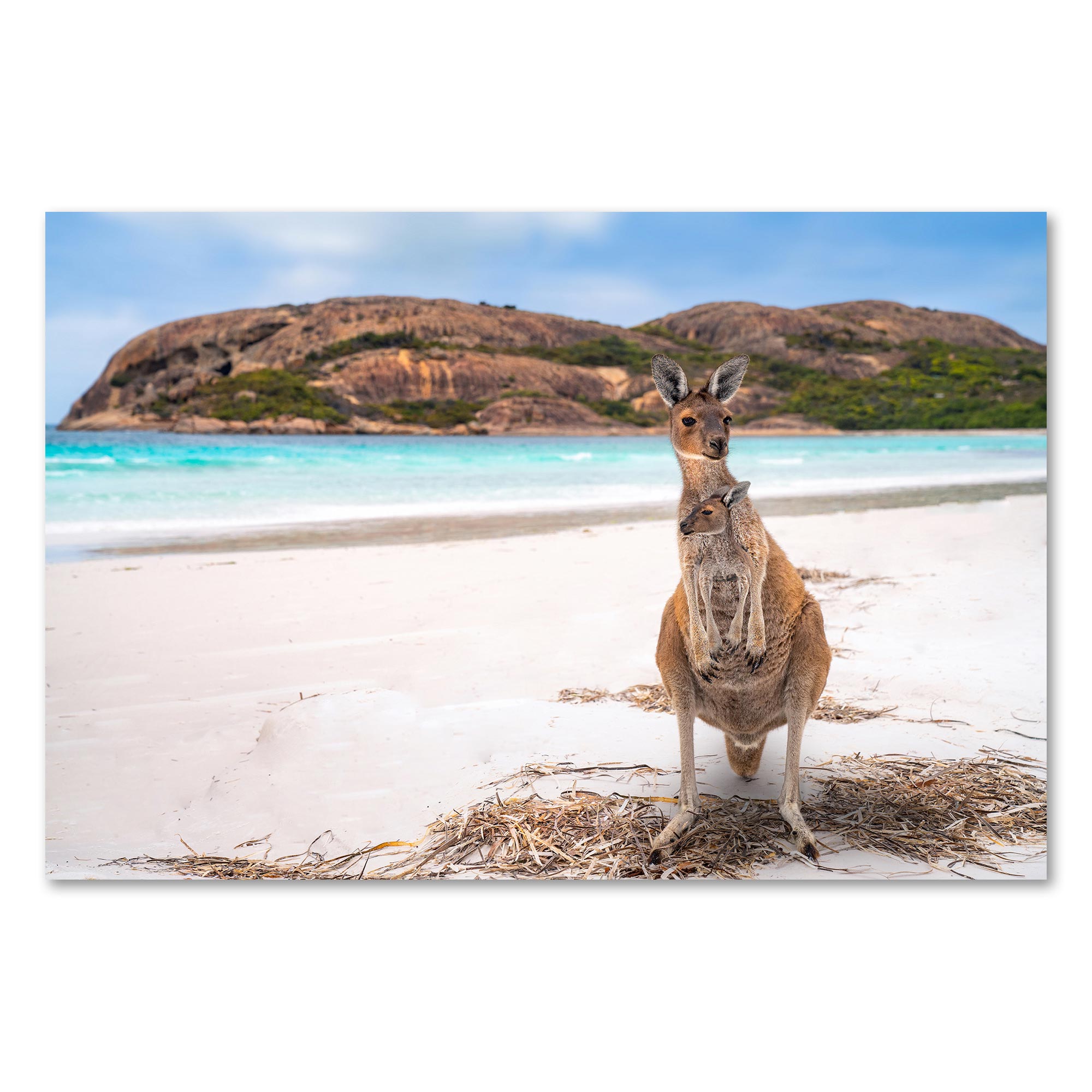 Ein Känguru mit seinem Baby im Beutel steht am weißen Sandstrand und blickt aufs türkisblaue Meer. Im Hintergrund erheben sich grüne Hügel.