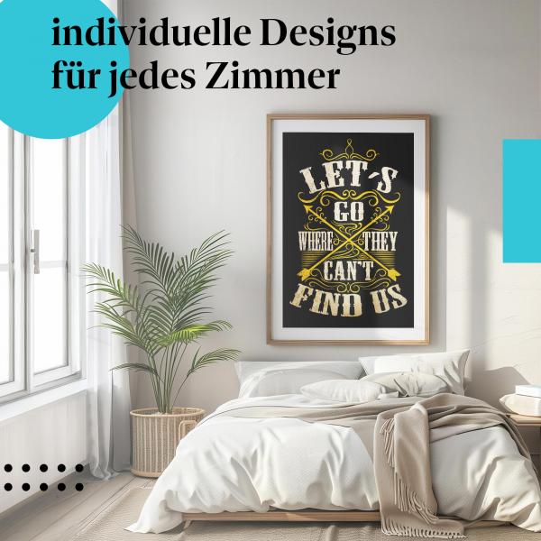 Dieses abenteuerliche Motiv zeigt den Spruch "Let's Go Where They Can't Find Us" im Vintage-Look.