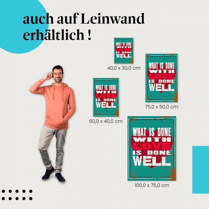 Inspirierendes Zitat auf türkisfarbenem Hintergrund: "Was mit Liebe getan wird, ist gut getan." Dieses Bild ist eine Botschaft für alle, die an die Kraft der Liebe glauben und mit Hingabe ihre Ziele verfolgen.