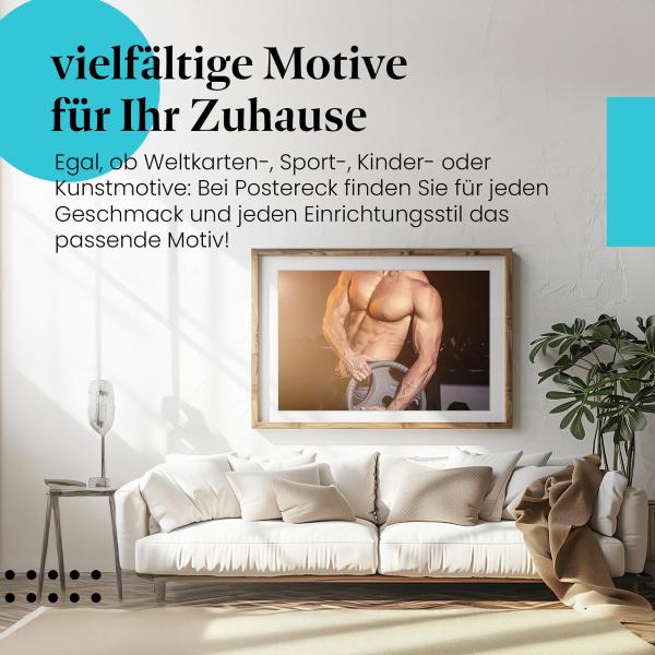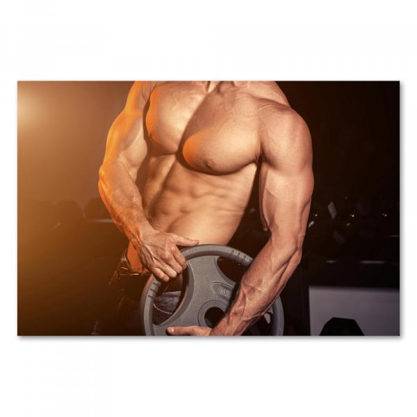 Dieses motivierende Motiv zeigt einen muskulösen Mann im Fitnessstudio, der eine Gewichtsscheibe in der Hand hält. Ein kraftvolles Bild, das für Zielstrebigkeit und Disziplin steht.