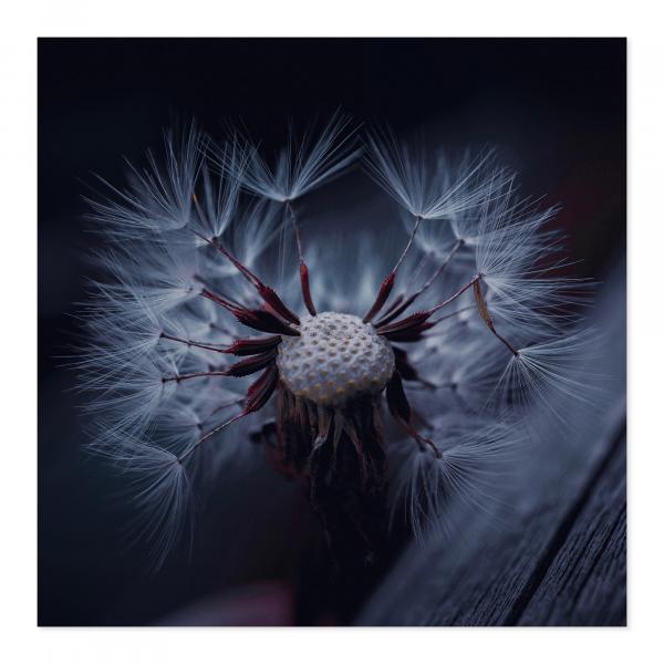 Mystische Atmosphäre: Eine Pusteblume im Zwielicht, ihre feinen Samen kurz davor, vom Wind davongetragen zu werden. Ein Symbol für Vergänglichkeit und Veränderung.