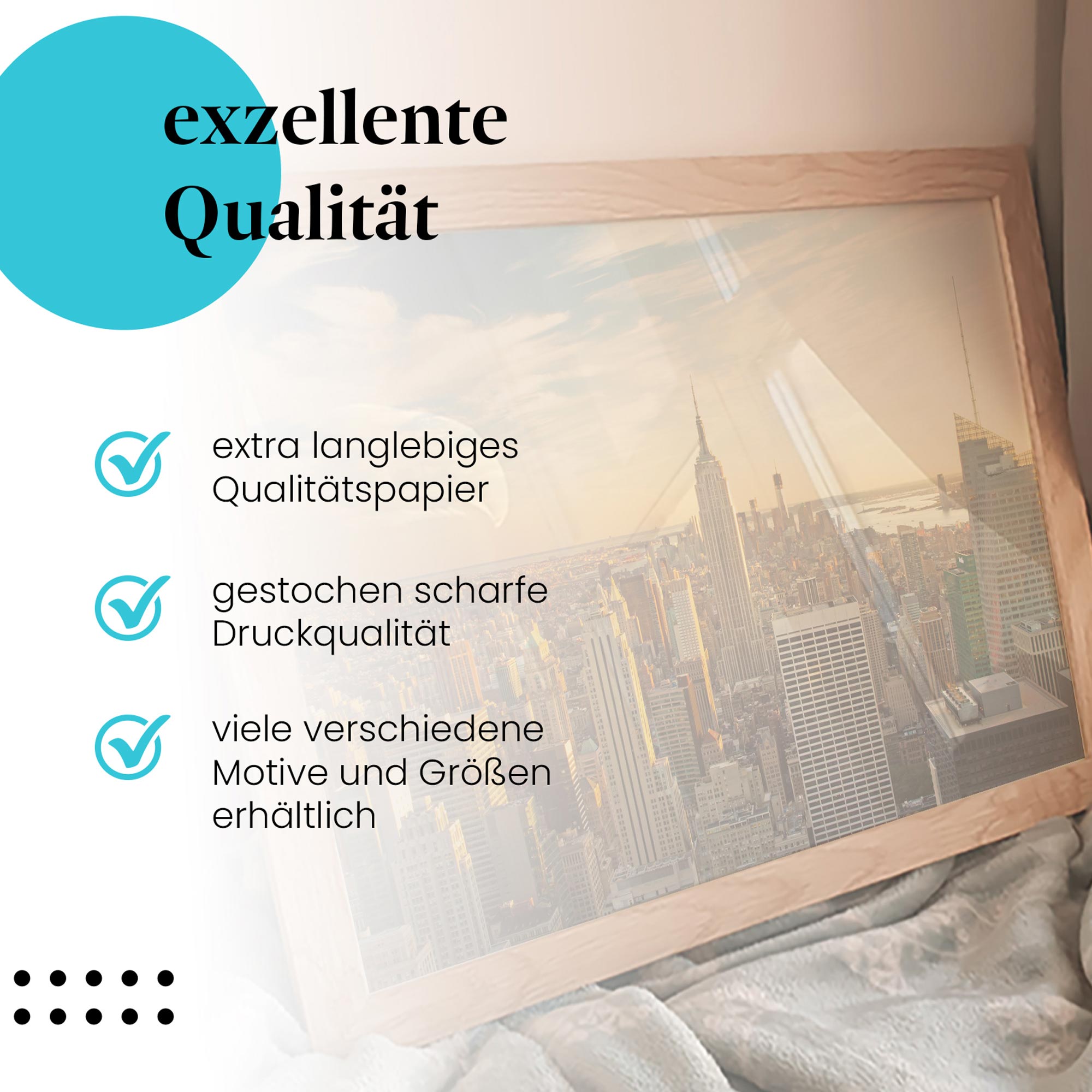 - Hochwertige Leinwand auf Echtholzrahmen (bei Leinwandbildern):