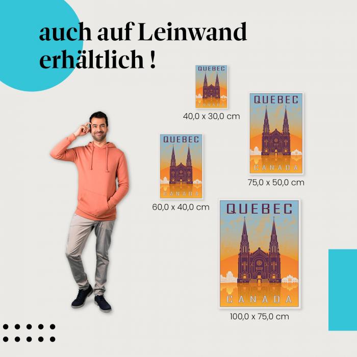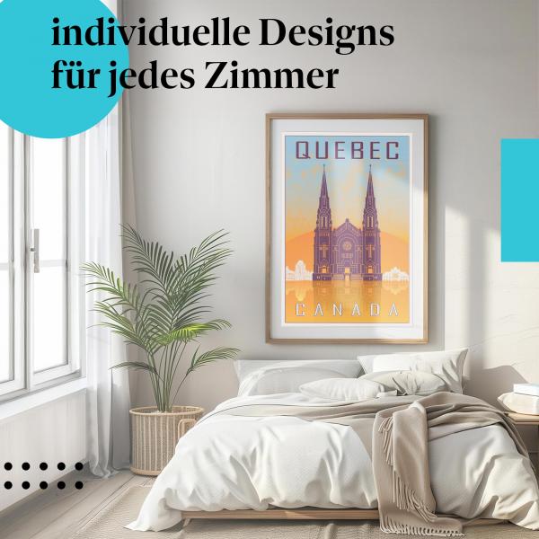 Dieses stilisierte Reiseposter zeigt Quebec mit der Basilika Sainte-Anne-de-Beaupré im Vordergrund. Der orangefarbene Himmel und die Spiegelung im Wasser schaffen eine warme Atmosphäre.