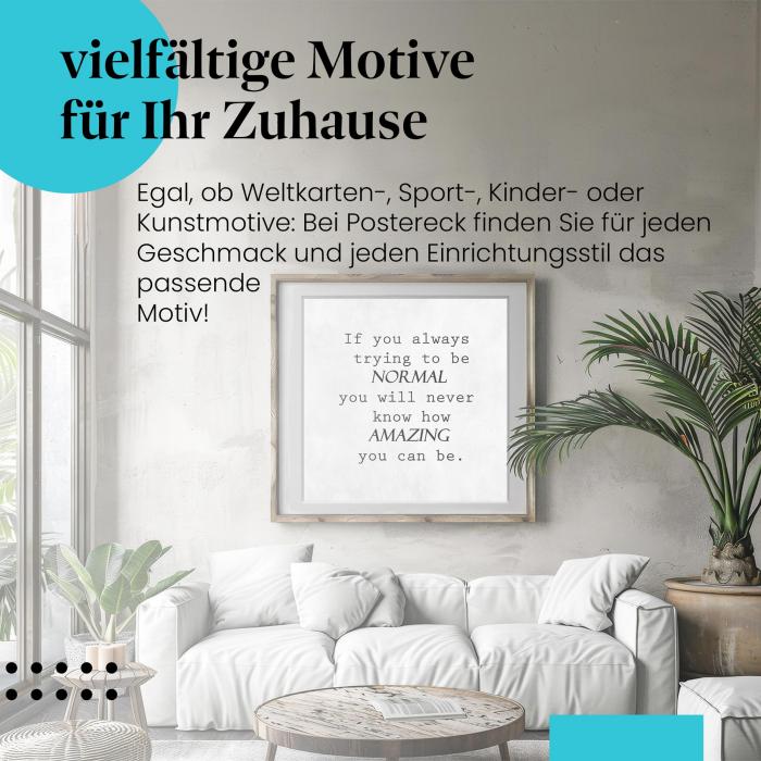 Inspirierendes Zitat auf weißem Hintergrund: "Wenn du immer versuchst, normal zu sein, wirst du nie erfahren, wie großartig du sein kannst."