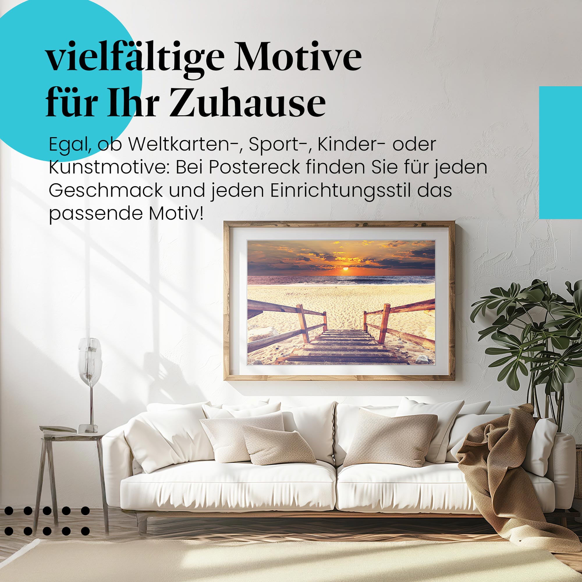 Bestellen Sie "Sonnenuntergang am Strand: Holztreppe" und träumen Sie von einem Urlaub am Meer!