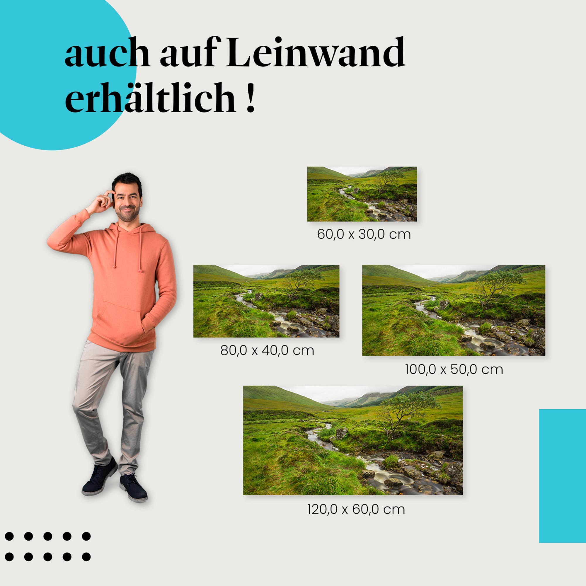 Ein idyllischer Bach schlängelt sich durch die saftig grünen Hügel der schottischen Highlands. Ein Ort der Ruhe und Besinnung inmitten der Natur. Dieses Bild verkörpert die Schönheit und die Stille der schottischen Landschaft.
