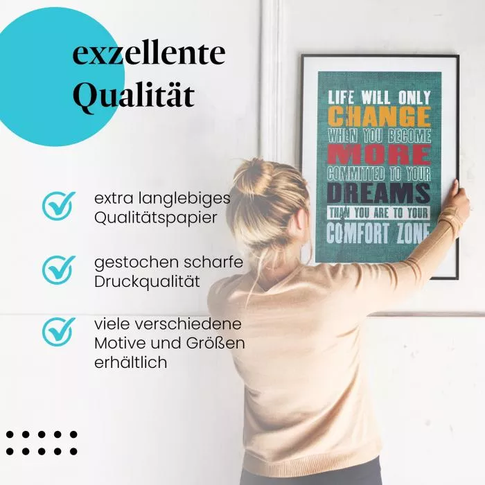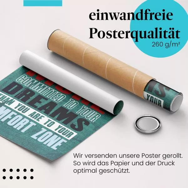 Dieses motivierende Motiv mit der Botschaft "Life Will Only Change When You Become More Committed To Your Dreams Than You Are To Your Comfort Zone" fordert dich dazu auf, die Komfortzone zu verlassen und für die eigenen Träume zu kämpfen.