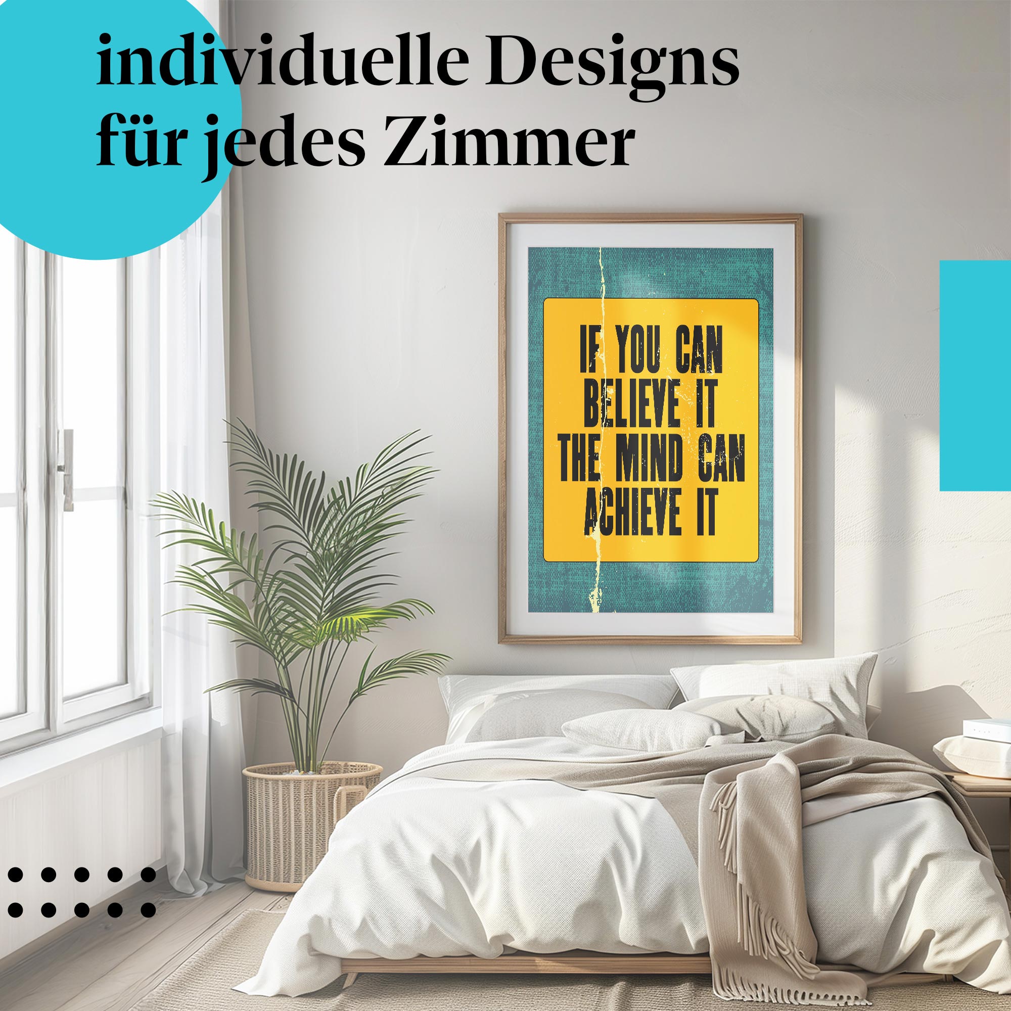 Dieses inspirierende Motiv mit der Botschaft "If you can believe it, the mind can achieve it" auf gelbem Hintergrund ermutigt dich, an deine Träume zu glauben und dein volles Potenzial zu entfalten.