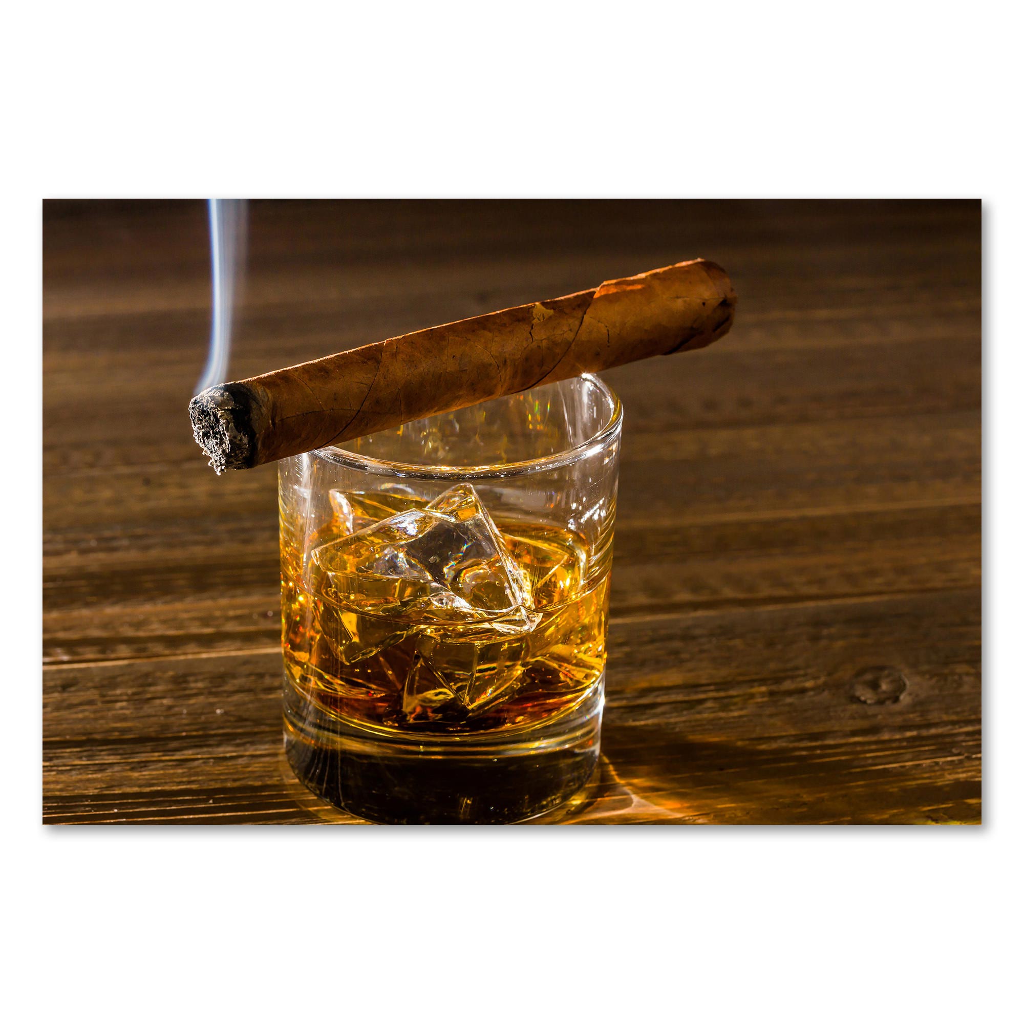 Ein Glas Whiskey mit Eiswürfeln steht auf einem Holztisch. Eine rauchende Zigarre liegt quer über dem Glas. Ein Bild von Entspannung und Genuss.